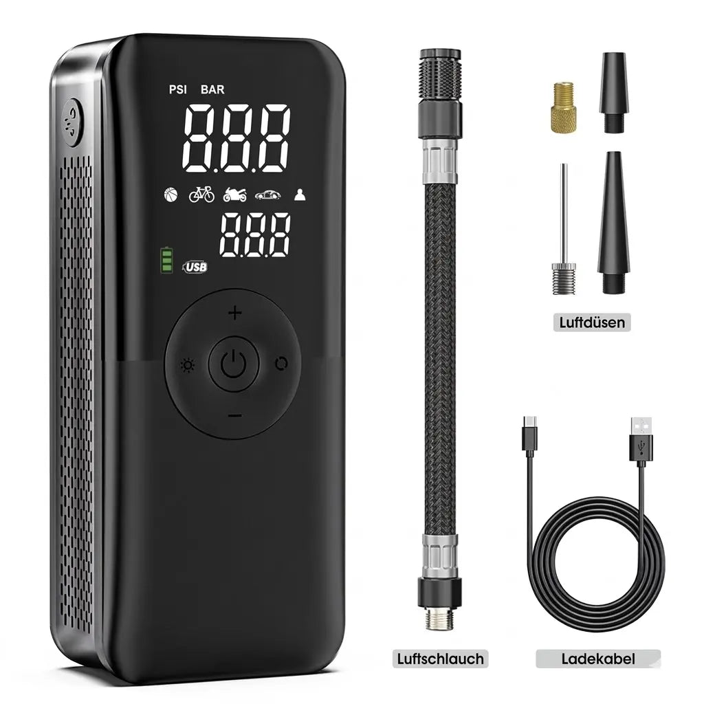 📦 ALLES INKLUSIVE: Pro-Inflate Kompressor, USB-C Ladekabel und 4 Universal-Aufsätze für Auto, Bike, E-Scooter und Bälle.