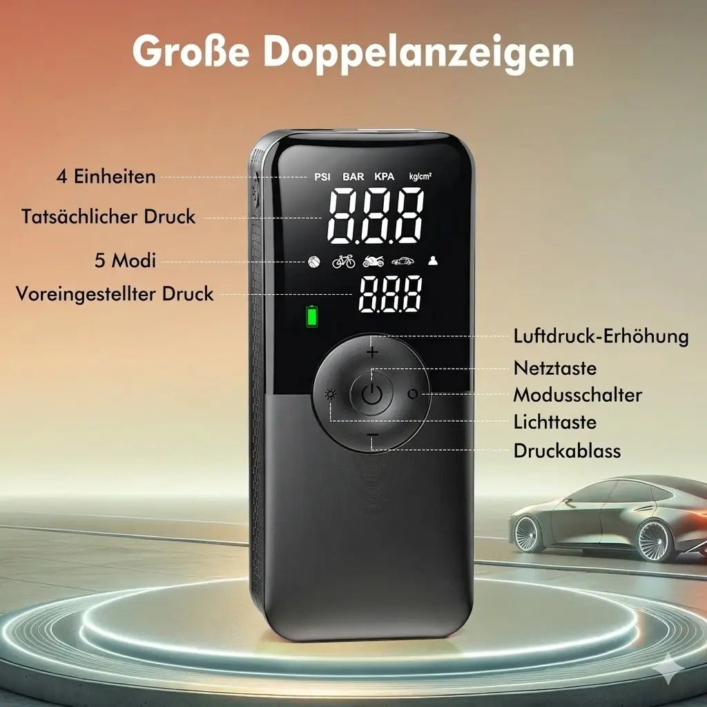 Der Pro-Inflate Kompressor vereint technische Exzellenz mit modernem Design. Entwickelt für anspruchsvolle Autoliebhaber, die Wert auf Qualität und Zuverlässigkeit legen. Mit seiner kabellosen Freiheit und beeindruckenden Leistung setzt er neue Maßstäbe in der mobilen Reifenpflege.